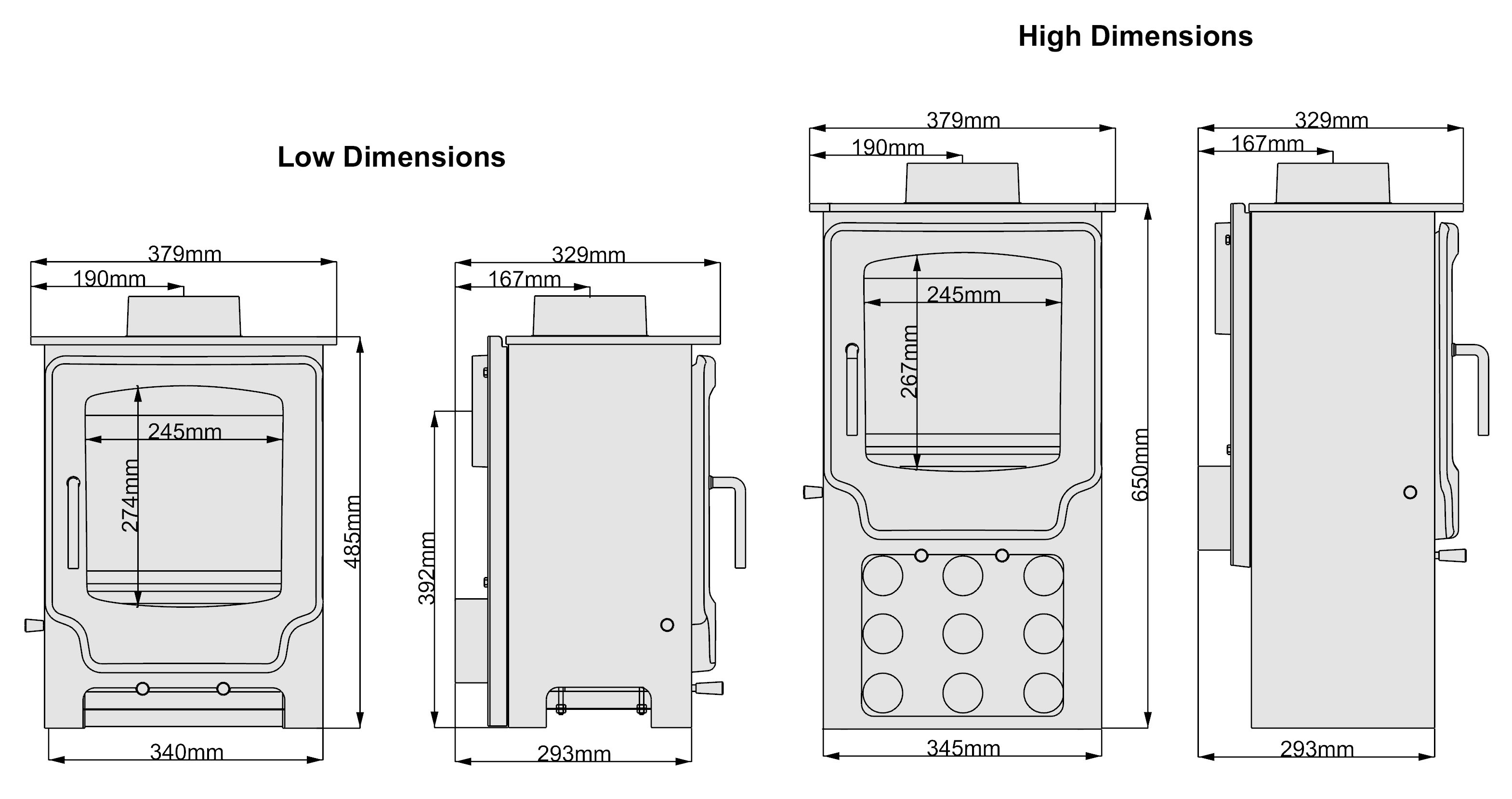 - Distance to Combustibles 500mm to side walls / 100mm to rear wall